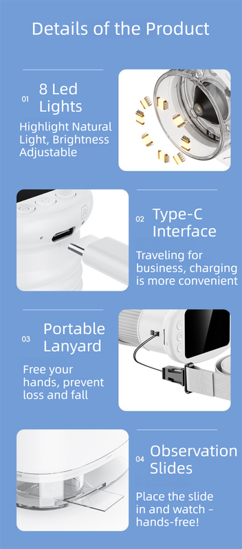 • Illumination: Features 8 adjustable LED lights to ensure bright, clear viewing of specimens.