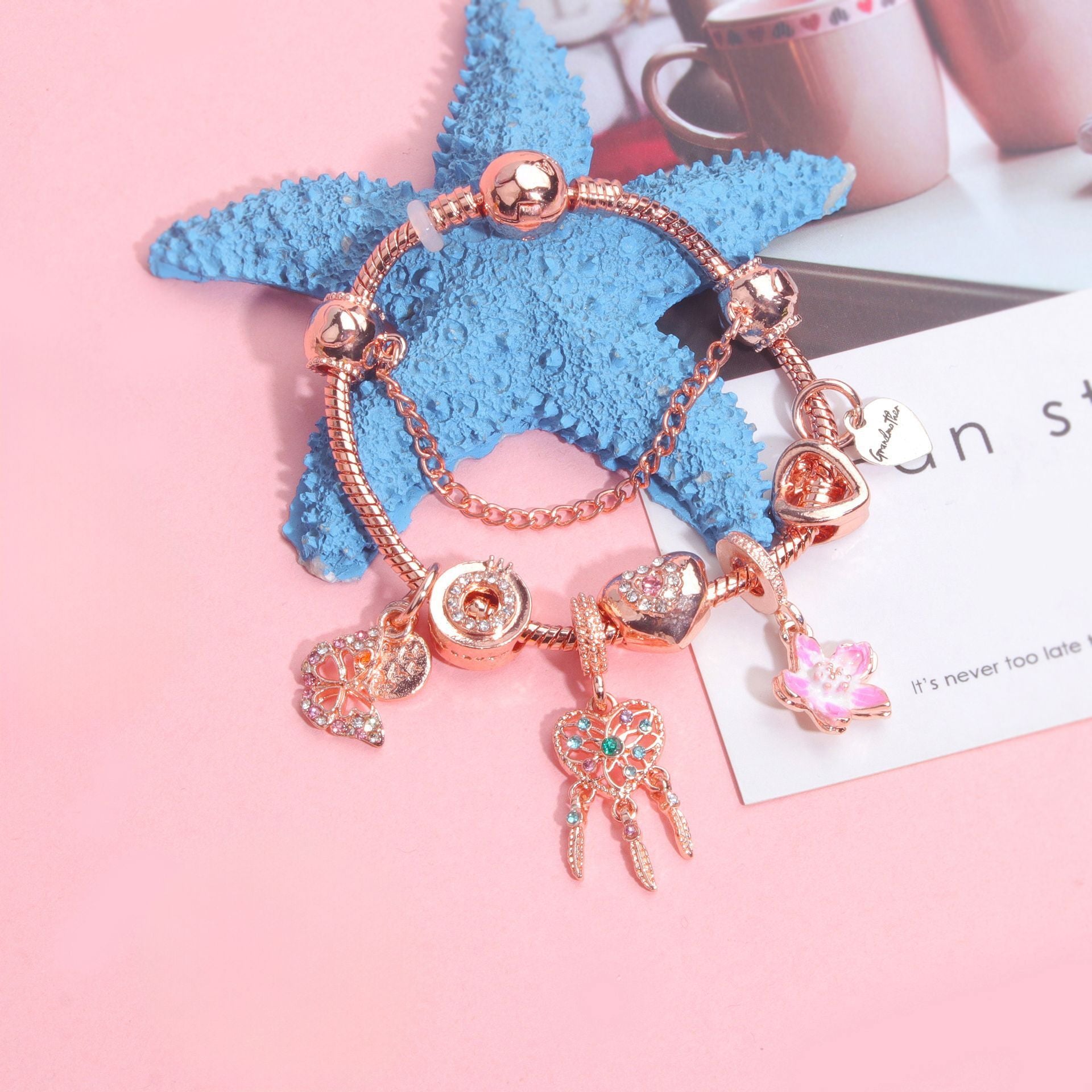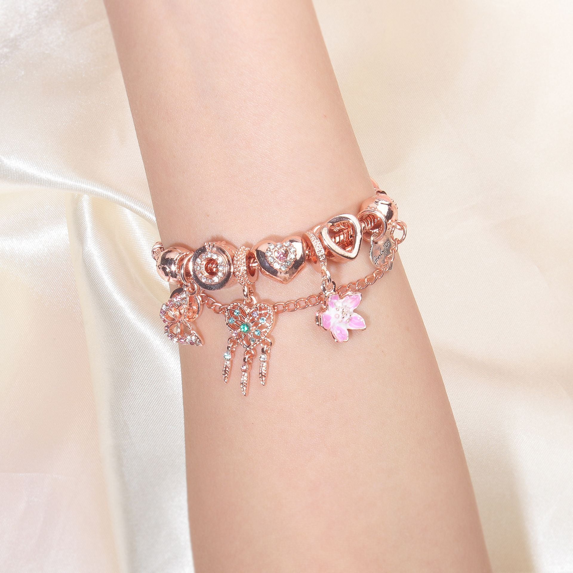 Rose Gold Bracelet with Dreamcatcher Lily Pendant, Crystal Zircon Beads - Fashion Jewelry for Women, 4 Sizes (17-20cm) |
