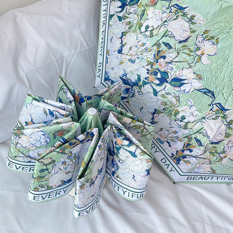 Stay protected from the sun and rain with our delightful patterned folding umbrella! This compact and lightweight umbrella features a beautiful design, perfect for adding a touch of elegance to your everyday style. Its five-fold, six-rib construction makes it incredibly portable, easily fitting into your purse or backpack.