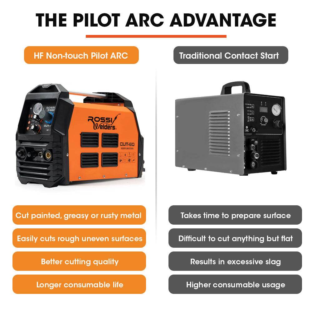 The Rossi Next Gen CUT-60 Pilot Arc Plasma Cutter is the latest innovation in high-power plasma torches. This powerful, lightweight inverter has true DC inverter technology to produce 104 volts up to 60 amps.