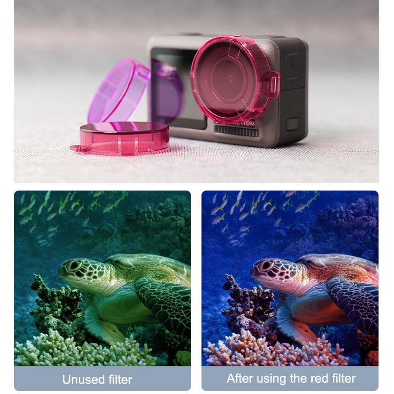 • Red filter for the bluish environment, purple filter for the green environment, and pink filter can restore the colour of blue water to obtain a natural and warm colour.