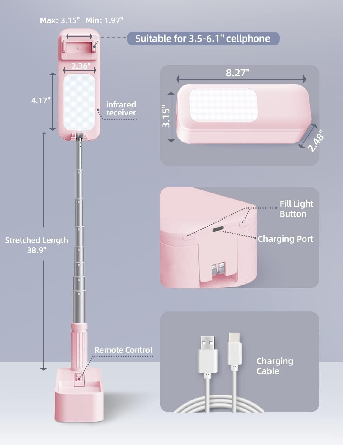 • [Double-Sided Fill Light] The foldable selfie stand has 3 color lighting modes (7 brightness levels): cold white, white and warm white. Double sided lighting makes photos or videos more natural and soft.Great for dirferent scenes.