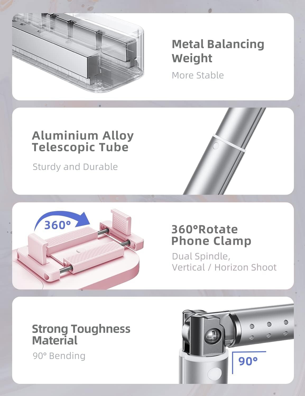 • [Adjustable 360 Rotate] Height adjsutable up to 49.2'' used as a floor stand or desktkop selfie stand occasions. 360 rotate phone clamp and light board, easily to switch between different angle to match your shooting angle needs .The joint of front holder is 90 bendable which supports overhead recording.