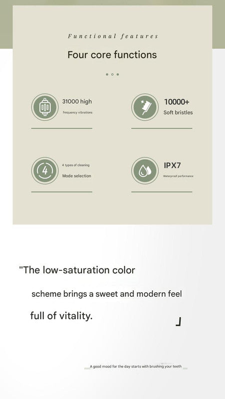 Experience superior cleaning power with our Sonic Electric Toothbrush, delivering an incredible 31,000 vibrations per minute for an unimaginable clean. This toothbrush features DuPont bristles with over 10,000 soft filaments, each with a diameter of just 0.001mm -C 50% softer than ordinary bristles -C ensuring a gentle, baby-soft experience that reaches deep into oral corners for a better cleaning effect. Choose between two brush head types to suit your preference. With four core functional features: 31,000 high-frequency vibrations, 10,000+ soft bristles, 4 cleaning modes, and IPX7 waterproof performance, this toothbrush is designed to elevate your oral hygiene. Its modern, aesthetically pleasing design with low-saturation finishes brings a touch of sweetness and vitality to your daily routine. The kit includes the main toothbrush unit, a charging base, two brush heads, and a convenient travel case for clean and portable storage.