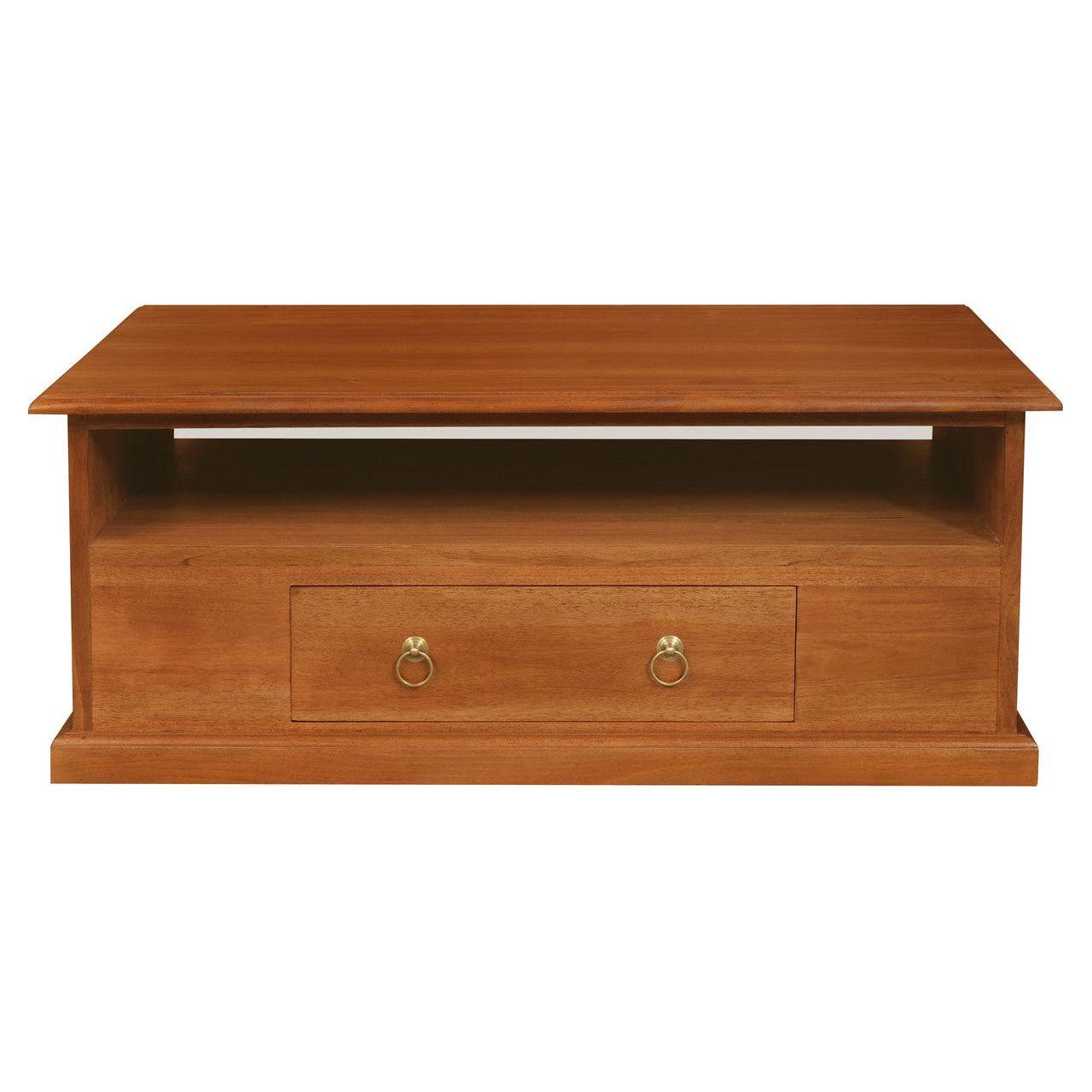 Crafted from solid mahogany timber, the Tasmania Coffee Table brings timeless elegance and durability to your living space. With its rich, natural textures and sturdy construction, it offers ample storage with two drawers and an open shelf, keeping your essentials organized and within reach. Available in three sophisticated finishes—Chocolate, Light Pecan, and Mahogany—this versatile piece adds a refined touch to any room. Best of all, no assembly is required, allowing you to enjoy it right away.
