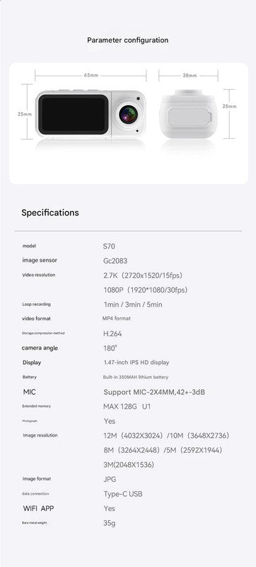Unleash your creativity and capture life's moments hands-free with our Thumb-Sized 2.7K Camera. This incredibly compact camera weighs a mere 35.6g and can easily attach to your clothing or accessories using its strong magnetic mount. It boasts a 180-degree rotatable lens, allowing for versatile shooting angles, whether it's first-person point of view or a creative third-person perspective. Record in crisp 2.7K video or capture high-resolution still images (12MP/8MP/5MP/3MP options available). The 1.47-inch high-definition display allows you to see what you're recording in real-time. The camera supports loop recording (1min/3min/5min segments), H.264 video encoding, WiFi connectivity for app control, and expandable storage up to 128GB (microSD card required, not included). It features an internal 350mAh battery offering substantial usage time. This camera unlocks super creative viewpoints for expressing yourself through life and motion.