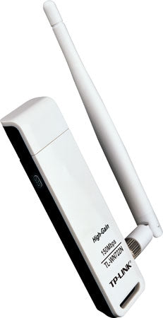 TP-Link TL-WN722N N150 High Gain Wireless USB Adapter 2.4GHz (150Mbps) 1xUSB2 802.11bgn 1x4dBi Omni Directional Antenna WPS button Exceptional wireless speed up to 150Mbps brings best experience for video streaming or internet calls Easy wireless security encryption at a push of the WPS button 4dBi detachable antenna, remarkably strengthen signal power of the USB adapter What This Product Does Wireless N USB Adapter TL-WN722N allows you to connect a desktop or notebook computer to a wireless network and access high-speed Internet connection. Complies with IEEE 802.11n, they provide wireless speed up to 150Mbps, which is beneficial for the online gaming or even video streaming. Also, wireless security encryption could be established simply at a push of QSS (Quick Setup Security) button, preventing the network from outside threats. HARDWARE FEATURES Interface USB 2.0 Button WPS Button Dimensions ( W x D x H ) 3.7 x 1.0 x 0.4 in. (93.5 x 26 x 11mm) Antenna Type Detachable Omni Directional (RP-SMA) Antenna Gain 4dBi WIRELESS FEATURES Wireless Standards IEEE 802.11n, IEEE 802.11g, IEEE 802.11b Frequency 2.400-2.4835GHz Signal Rate 11n: Up to 150Mbps(dynamic) 11g: Up to 54Mbps(dynamic) 11b: Up to 11Mbps(dynamic) Reception Sensitivity 130M: -68dBm@10% PER 108M: -68dBm@10% PER 54M: -68dBm@10% PER 11M: -85dBm@8% PER 6M: -88dBm@10% PER 1M: -90dBm@8% PER Transmit Power <20dBm Wireless Modes Ad-Hoc / Infrastructure mode Wireless Security Support 64/128 bit WEP, WPA-PSK/WPA2-PSK Modulation Technology DBPSK, DQPSK, CCK, OFDM, 16-QAM, 64-QAM Advanced Functions WMM, PSP X-LINK(For Windows XP), Roaming OTHERS Certification CE, FCC, RoHS Package Contents Wireless Adapter One USB extension cable Resource CD Quick Installation Guide System Requirements Windows 8.1 32/64bit, Windows 8 32/64bit, Windows 7(32/64bits), Windows Vista(32/64bits), Windows XP(32/64bits), Windows 2000 Environment Operating Temperature: 0℃~40℃ (32℉~104℉)