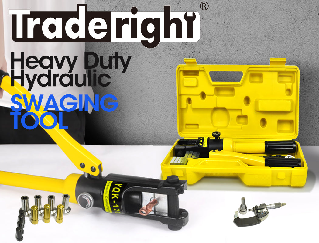 This hydraulic swage tool is a must-have. The force that this tool produces is not comparable to a non-hydraulic swage tool. With its 8T hydraulic ram, the force being produced ends up being up to ~64 Ton/in? at the point of application (amount of force varies depending on the die in use). This is enough force to pressure weld the fitting to the wire rope. The Heavy Duty Hydraulic Swaging Tool Provided with Tool - No.8, 10, 16, 25, 35, 50, 70, 95 and 120(standard dies). These dies are ideally suitable for swaging copper, aluminium etc. If you are swaging stainless steel you will need the two strengthened steel dies (8 and10), which are also included.