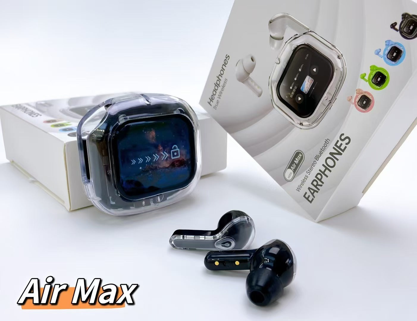 • Stylish Transparent Charging Case: Unique case design with an LED display resembling a phone lock screen.