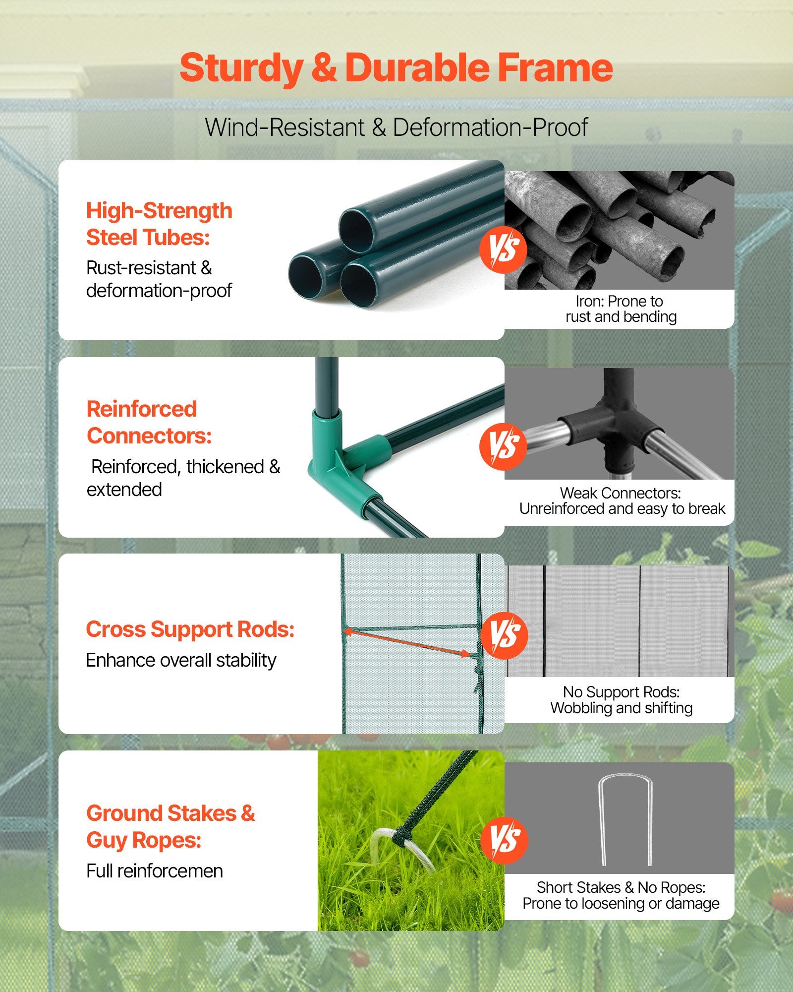 Made of powder-coated steel tubes, our plant protection tent is rust- and corrosion-resistant. Reinforced plastic joints and side support rods add stability, while U-shaped ground stakes and guy ropes provide wind resistance