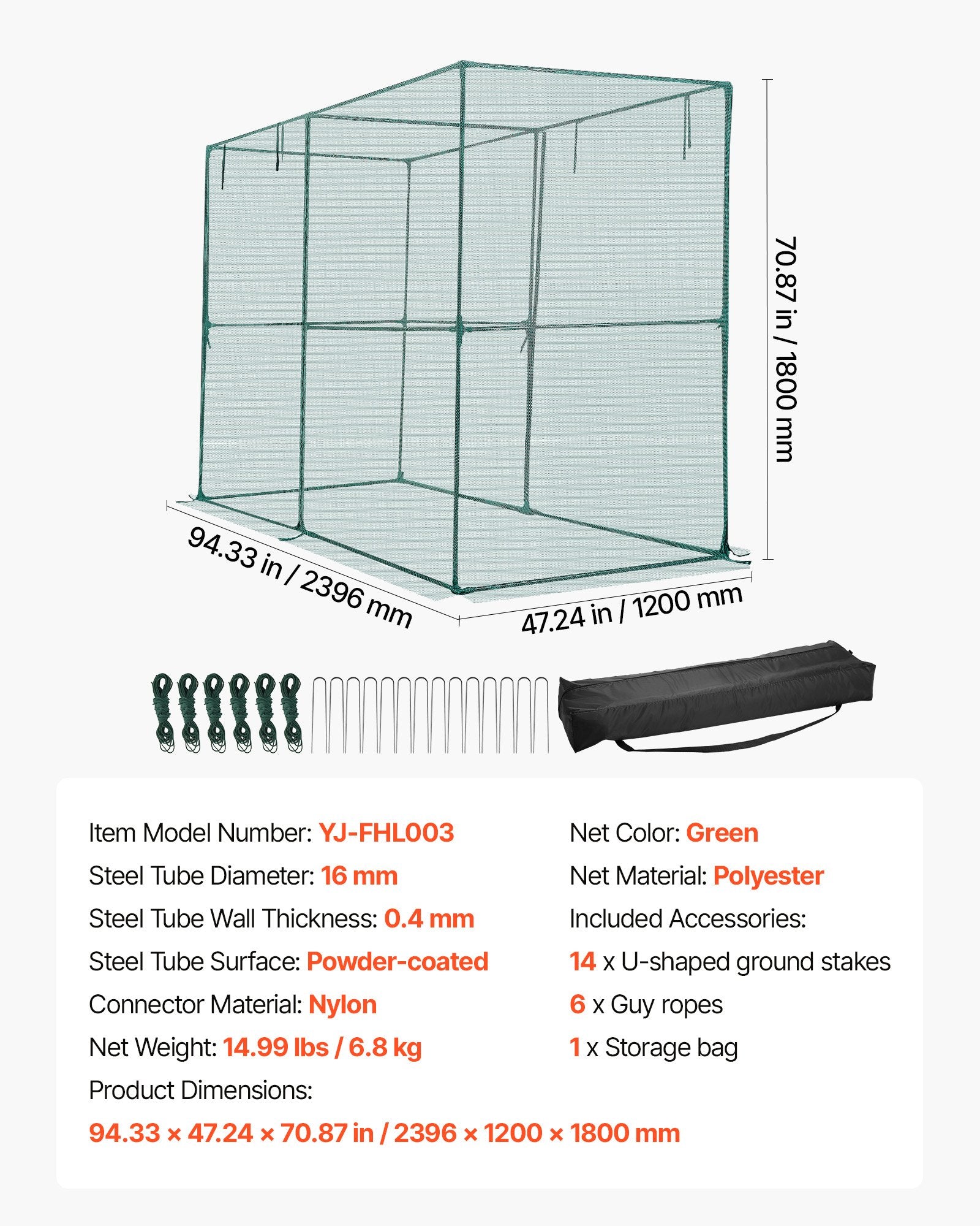 Measuring 94.33 x 47.24 x 70.87 in/2396 x 1200 x 1800 mm, this crop cages for garden provides ample space for vegetables, fruits, flowers, and other plants to thrive without external disturbance