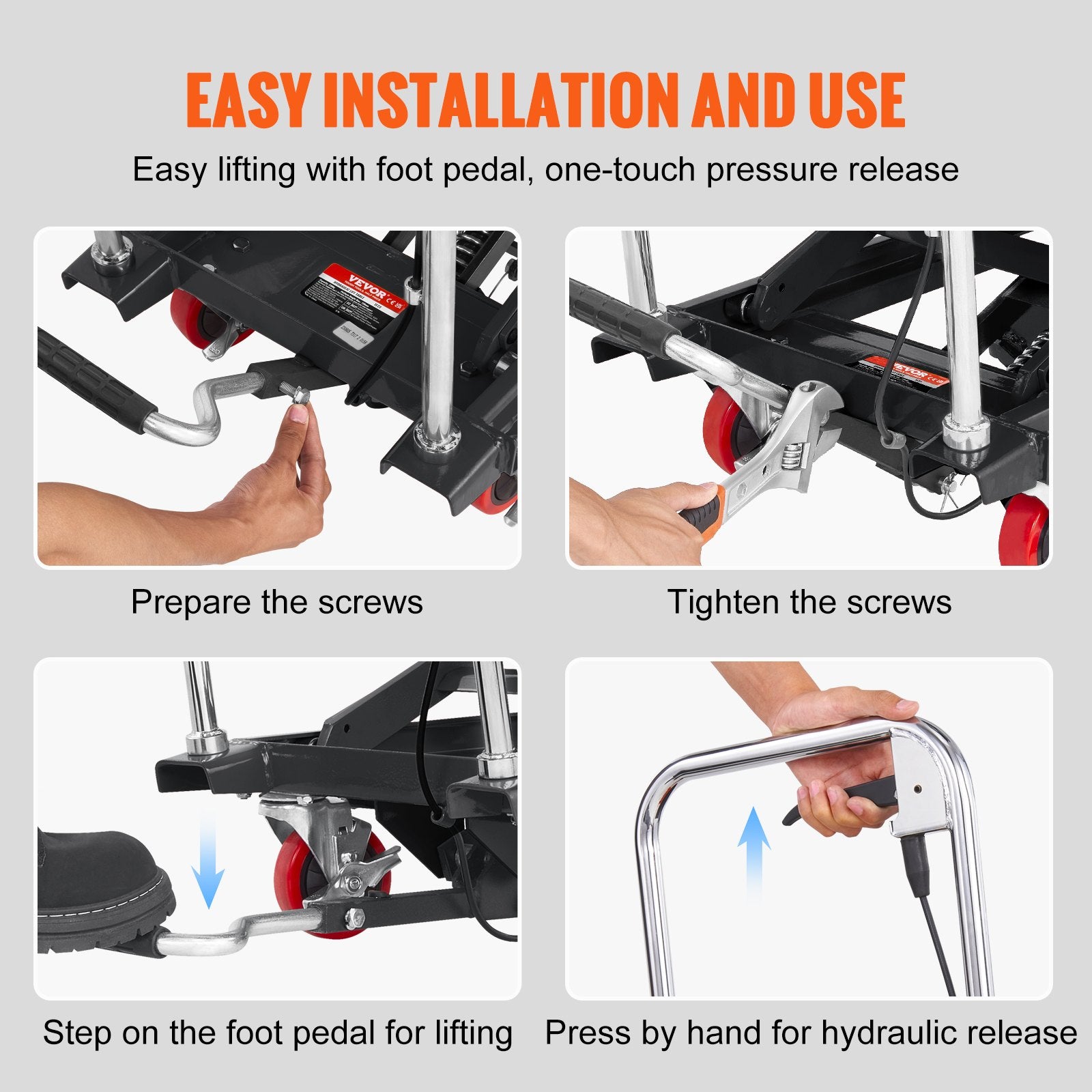 Experience impressive lift heights up to 28.5 inches with VEVOR hydraulic lift table cart. Our high-quality integrated hydraulic pump ensures efficient and reliable lifting without any oil leakage issues. Get the power you need for smooth and controlled lifting performance.