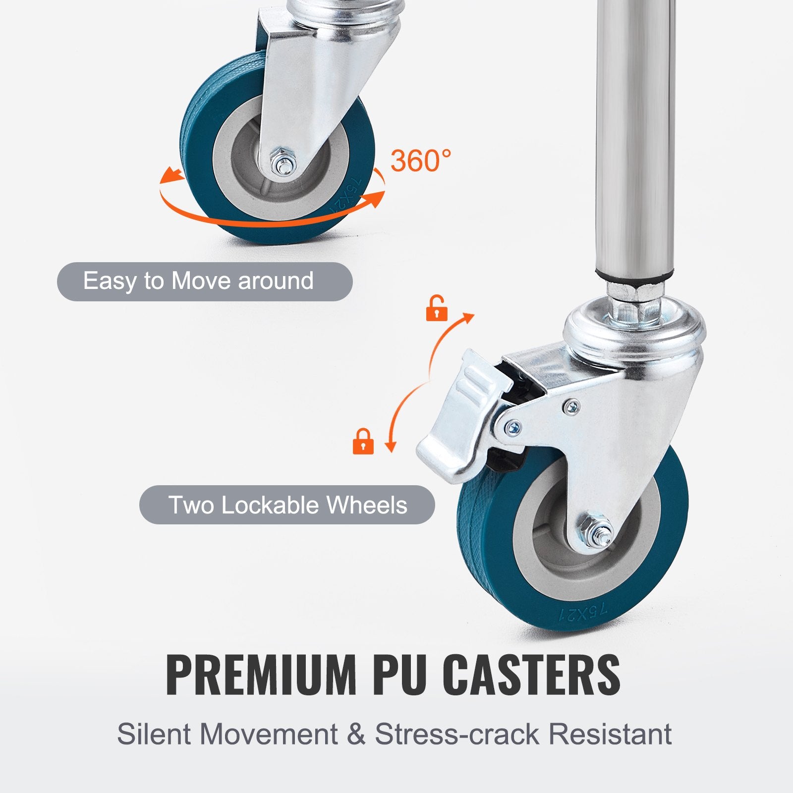 Equipped with four universal wheels and silent casters, this rolling cart moves smoothly even when fully loaded. Two locking casters provide stability on uneven surfaces. The wide handle ensures a comfortable grip for easy maneuvering.