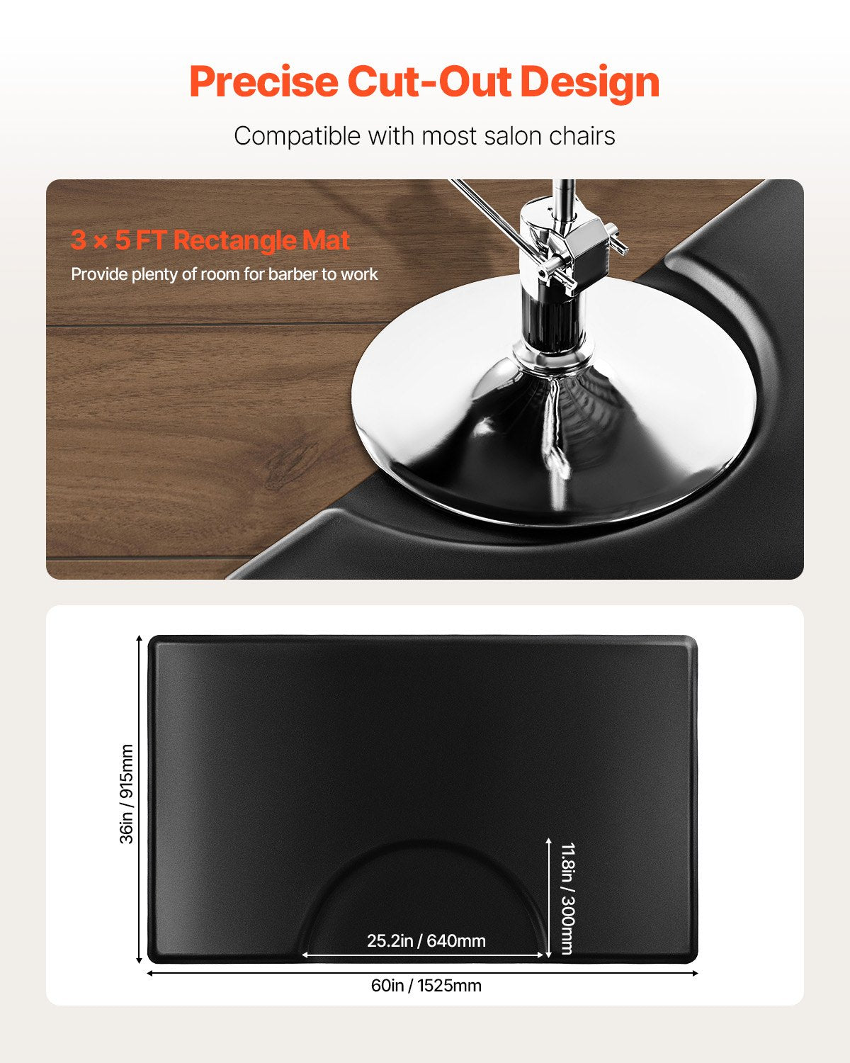 Our 1525 x 915 mm rectangle salon mat for hair stylists offers a spacious standing area, allowing barbers to move freely and work more efficiently. The 25.2" x 11.8" (640 x 300 mm) cut-out fits most salon chairs with a round base, staying securely in place without shifting