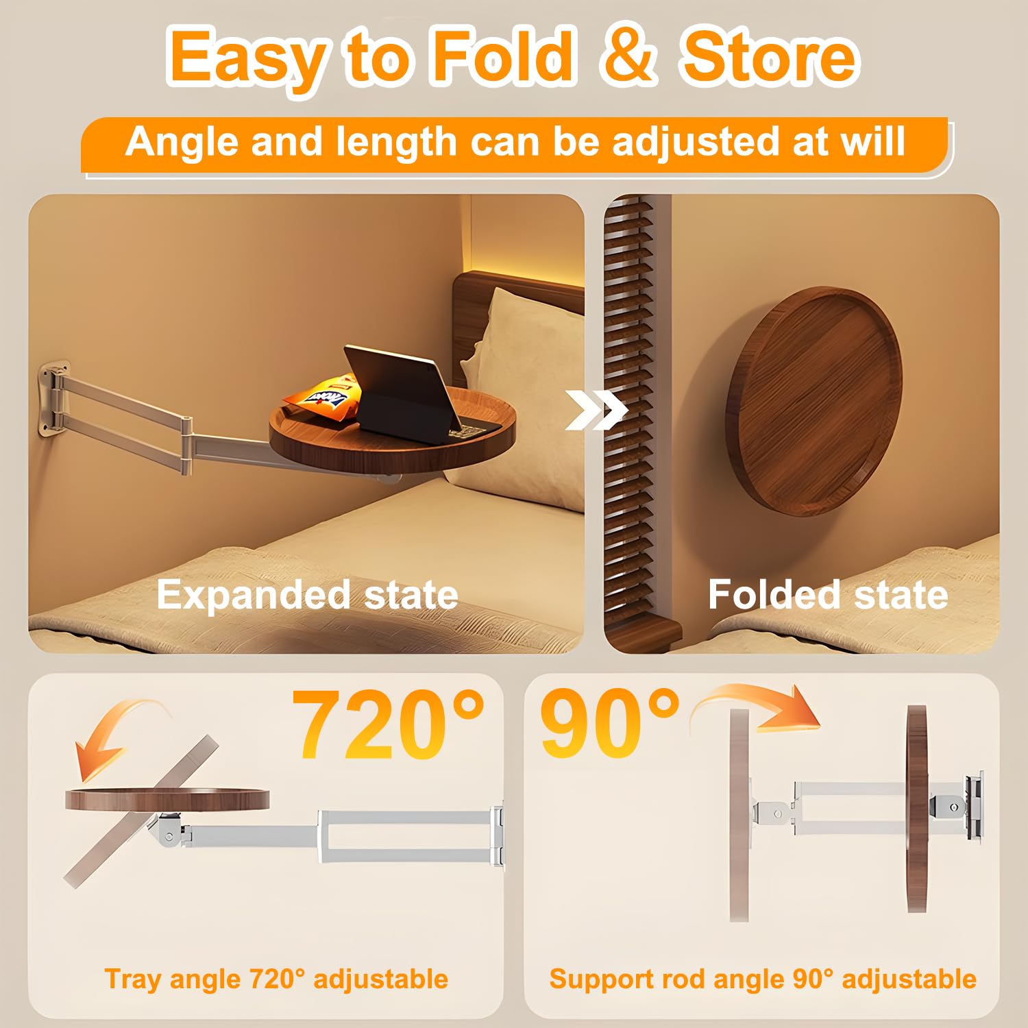 Wall-Mounted Foldable Round Table Telescopic Adjustable Bedside Desk with Aluminum Alloy Support, Multi-Use Floating Table for Bedroom, Living Room, Balcony