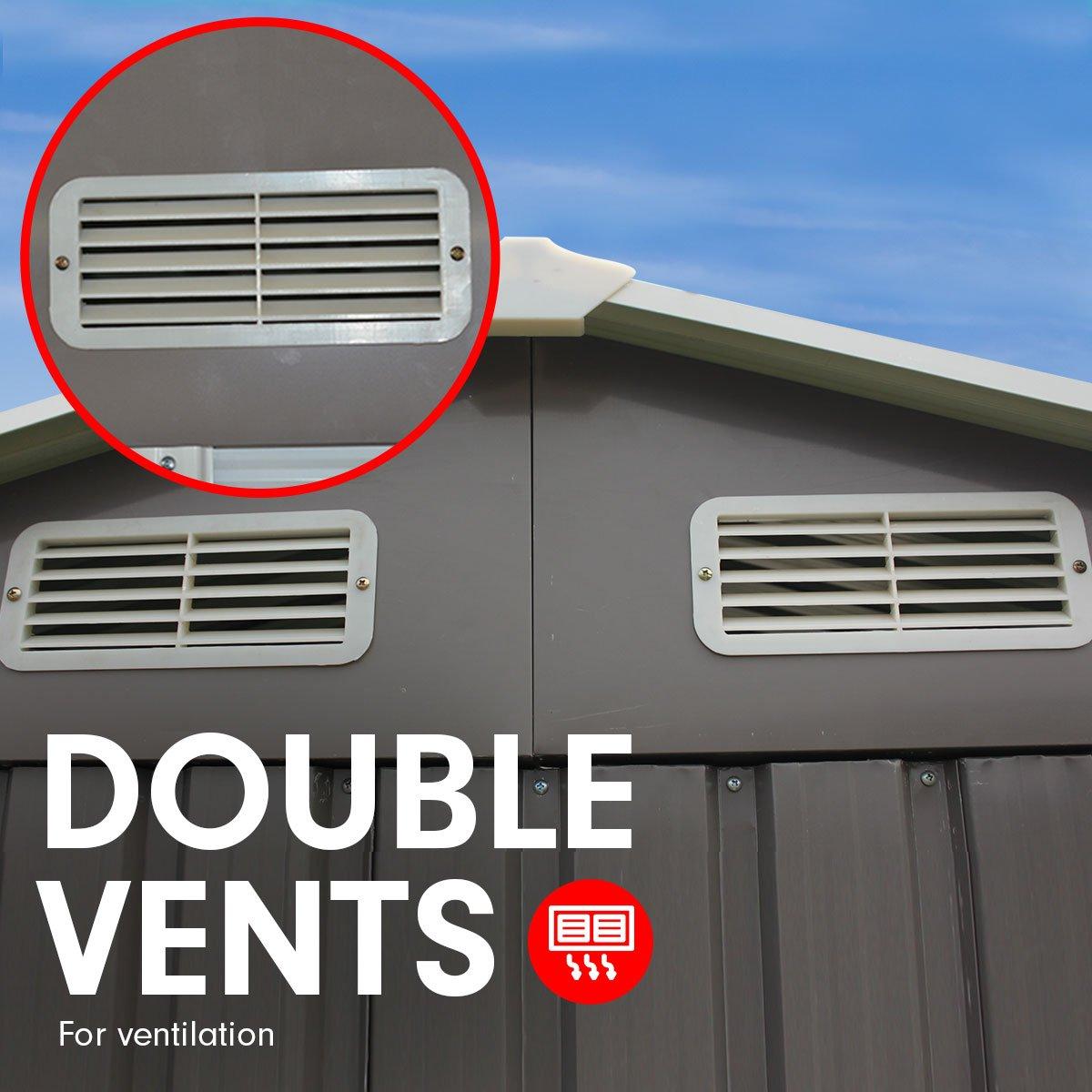 Constructed from galvanized steel and polypropylene this sturdy shed is weather and rust-resistant and designed to withstand the harshest weather elements. It features ventilation vents to let in air and natural light.